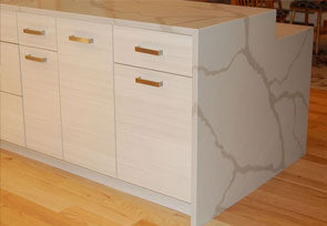 If you are looking for a bold look, we can stack or miter-laminate the edge of your counter to give the appearance of a thicker piece of stone. Waterfall legs are also a stunning addition to your island. A traditional countertop has a single horizontal surface that ends at the edge of an island, peninsula, or bank of cabinets. Waterfall legs drop vertically down the sides, creating a continuous flow of to the floor. The end result can be very dramatic.