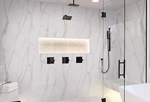 Wetwall™ is a patented, waterproof, tongue-and-groove bathroom panel system that locks water out without the grout. It’s a revolutionary design material that transforms bathrooms quicker, cheaper and easier than shower tile.