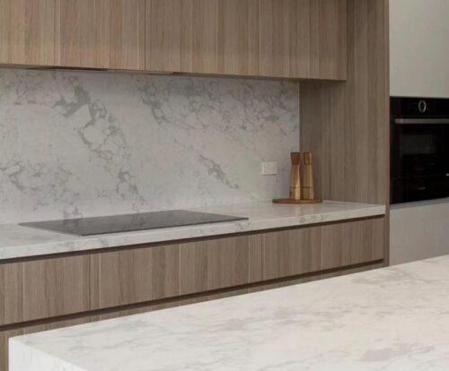 Want even more impact? A bookmatched slab backsplash brings artistry and symmetry to your space in a way tile simply can’t replicate.